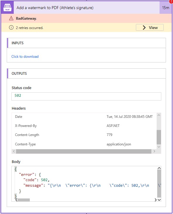 "message": "{\r\n "error": {\r\n "code": 502,\r\n "source": "flow-apim-europe-001-westeurope-01.azure-apim.net",\r\n "clientRequestId": "f3865ce3-01e2-44cd-b298-5502252034c0",\r\n "message": "BadGateway",\r\n "innerError": {\r\n "request": {\r\n "url": "/flow/v1/Documents/jobs/AddWatermarkToPdf",\r\n "traceId": "0HM17E21PBT3C:000006BE"\r\n },\r\n "error": {\r\n "code": "System.ArgumentException",\r\n "message": "Object of type 'System.Single' cannot be converted to type 'System.Boolean'.",\r\n "date": "2020-07-14T08:38:45.836282Z"\r\n }\r\n }\r\n }\r\n}, clientRequestId: f3865ce3-01e2-44cd-b298-5502252034c0"