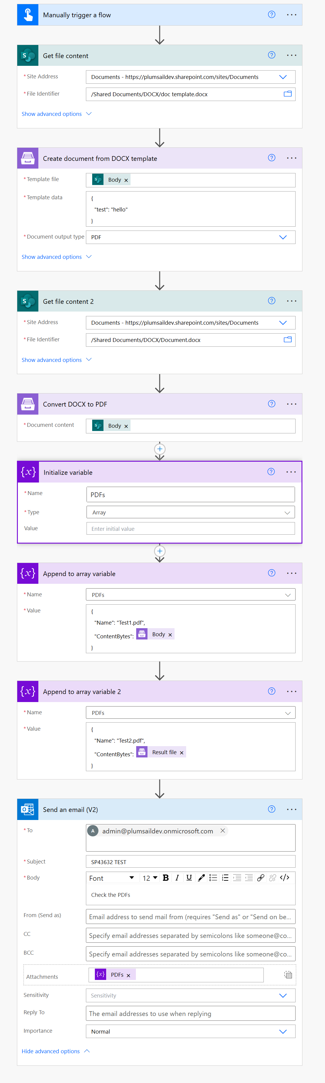 I am successfully creating and storing/saving plumsail docs from creation as a docx and then also converting them to pdf. After they come back I need to email them to an individual. So there would be an array of 2 converted plumsail pdf files ... I am using this technique here and sometimes it works and sometimes it doesn't work so when the recipient gets the email zero, one or both files are corrupted.
