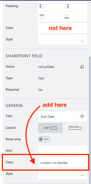 Then apply custom-no-border to the GENERAL Class, like so in Plumsail Designer: