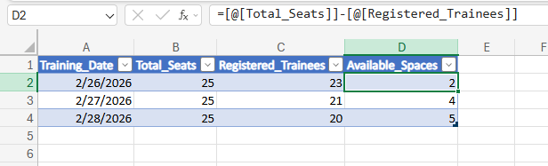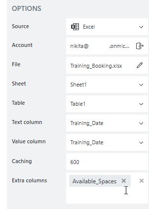 Hi, @Nikita_Kurguzov, apologies for the confusion. I meant to say that the additional column (i.e., remaining seats) pulled from the available training dates doesn’t update unless the source Excel file (which the form both pulls and adds data to and from) is open and refreshed (usually manually, because I can’t seem to make it refresh using Power Automate with ‘Get content’, ‘Get tables’, ‘Get row’, and ‘Update row’ actions).