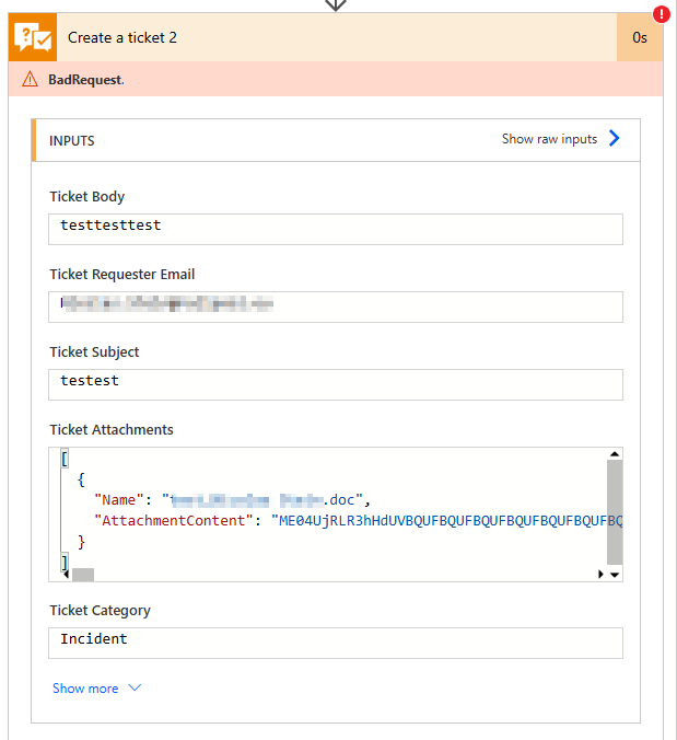 Thanks Evseychik, I have removed the expression (base64()) and it worked. We have other "Create ticket" action that uses base64() will it be an issue if the file type is .msg?