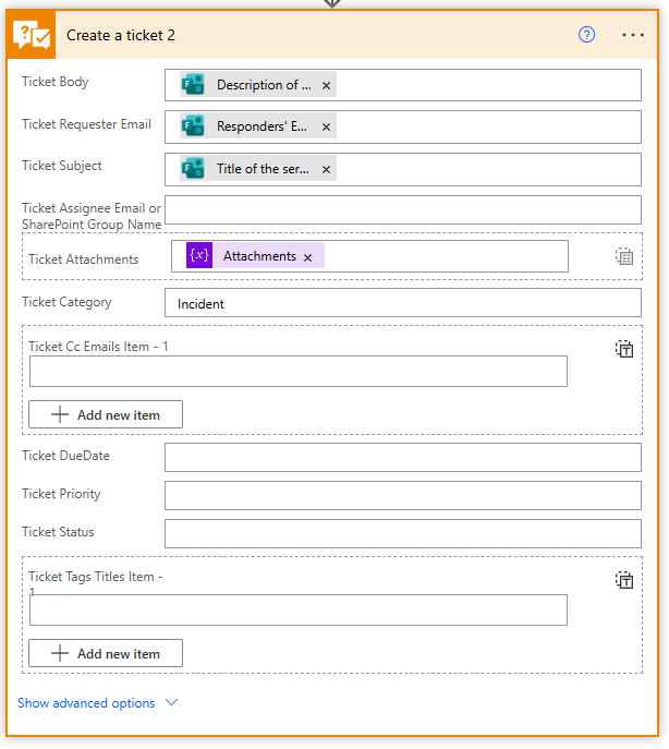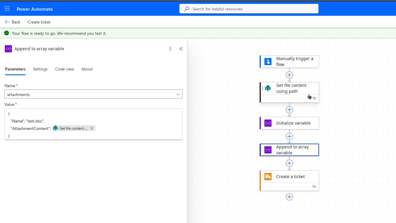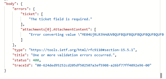 " OpenApiOperationParameterValidationFailed . The 'inputs.parameters' of workflow operation 'Create_a_ticket_(Request:_Courier)' of type 'OpenApiConnection' is not valid. Error details: The API operation '_flowV4TicketsPost' is missing required property 'ticket/attachments/0/AttachmentContent'"