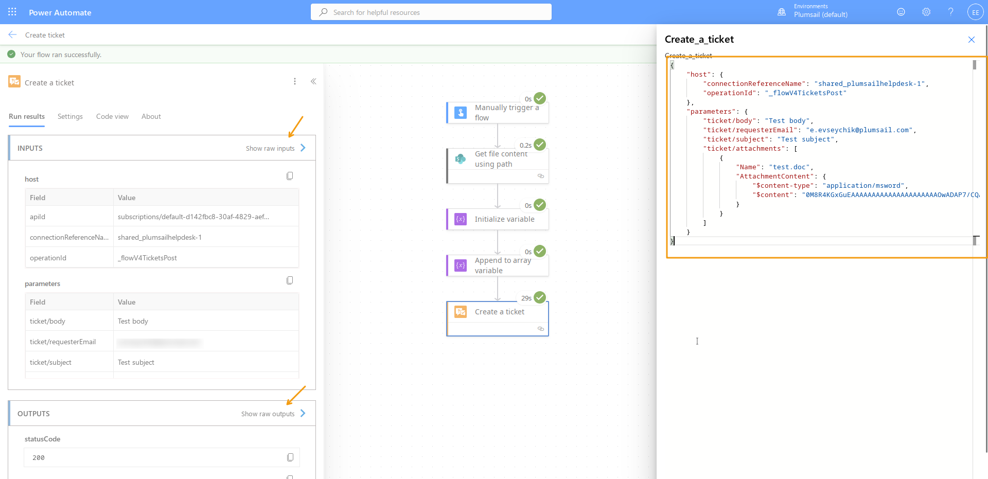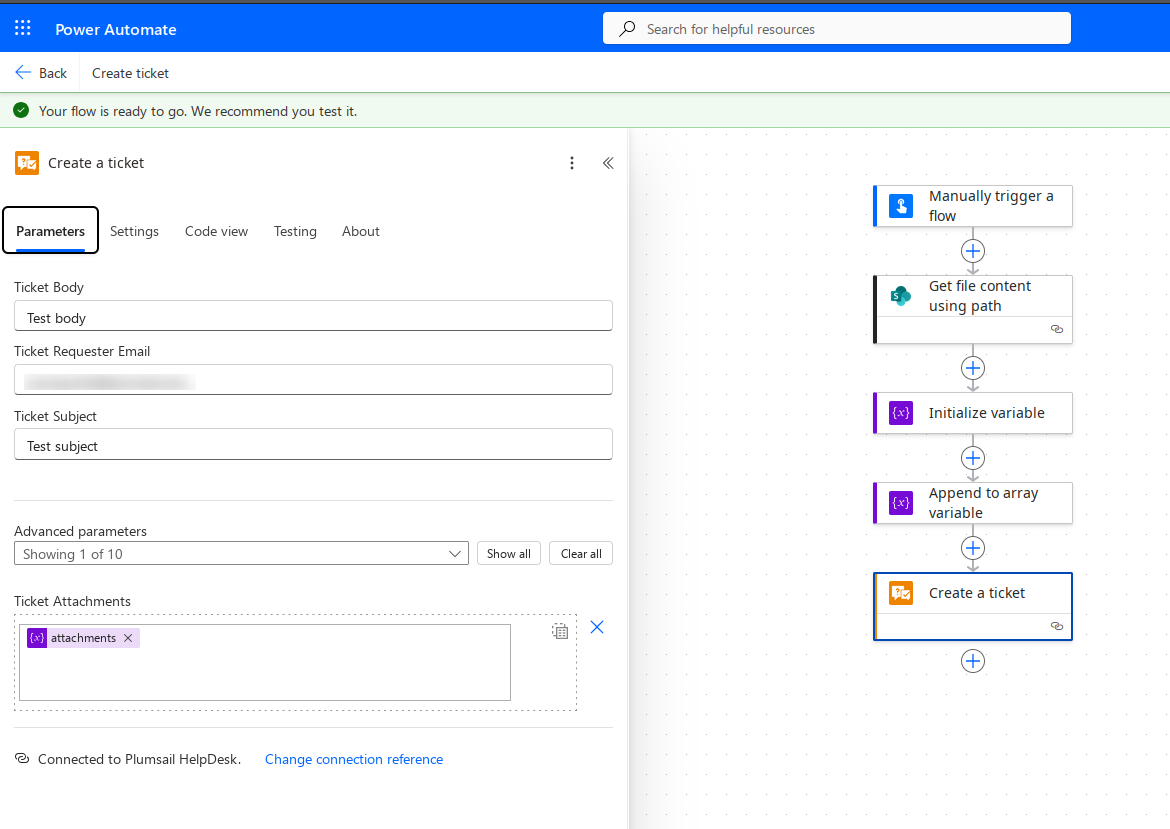 Please raise a ticket at support@plumsail.com, refer to this topic, and share the test file you tried to attach and raw inputs and outputs of the HelpDesk action. Save the latter as text and attach to your request.