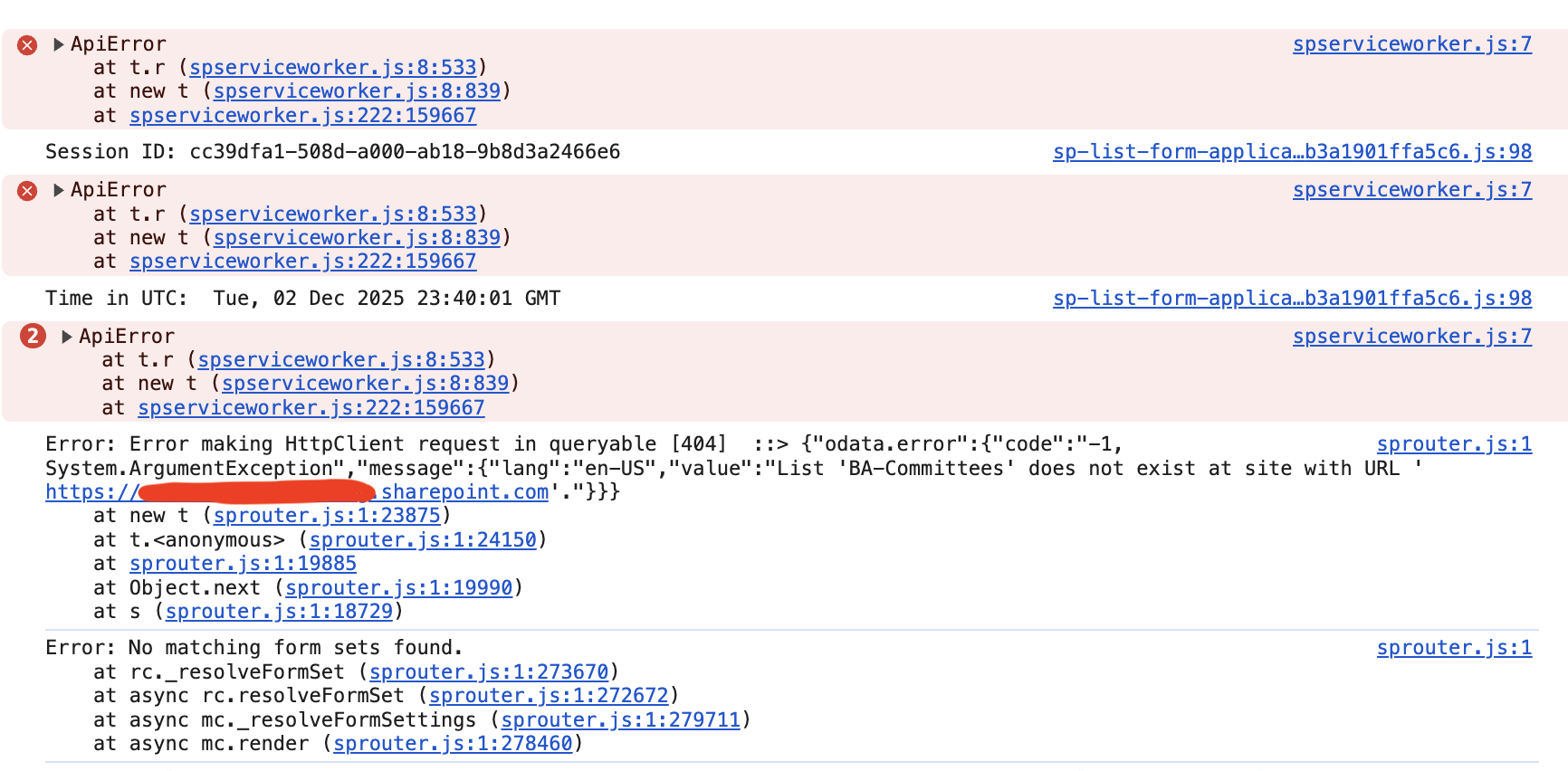 The problem i’m having is that any change to any item in any of my related lists (not the list itself, just adding or editing an item), will cause the very next load of the form to throw several errors in the console, then a 404 on my list, and the default form set loads in fullscreen mode (while all of these forms are set to dialog mode) . Error below.