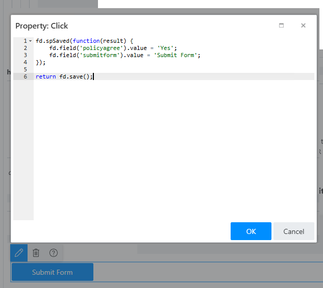 In Plumsail Designer (latest version), a custom button is configured; the two field values are set that trigger a backend Power Automate condition to send emails and render PDF copies of the completed form.