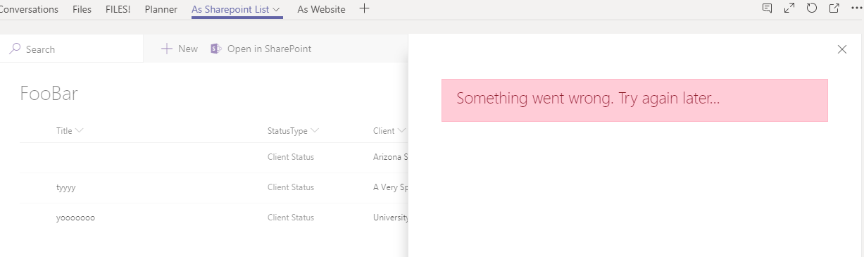 I'm testing Forms on a SharePoint list, so far so good when using it in a browser. But when I add a tab in Microsoft Teams to show the list, it only works when you choose the tab type 'Website'. When I add the tab as 'SharePoint' list, calling the form throws the following error "Something went wrong. Try again later..."