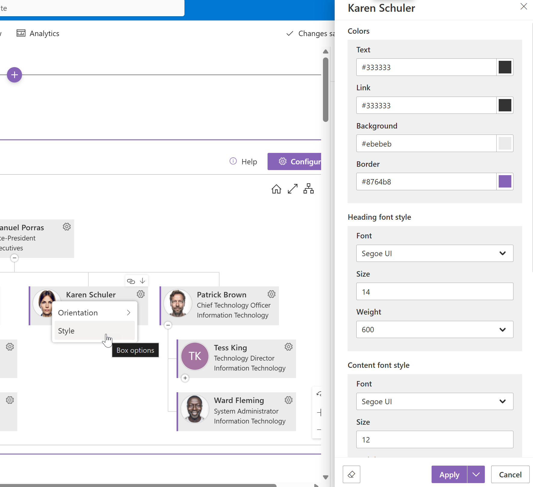 You can change style for a specific box if you edit the page with Org Chart, click the gear button on the box and change the style
