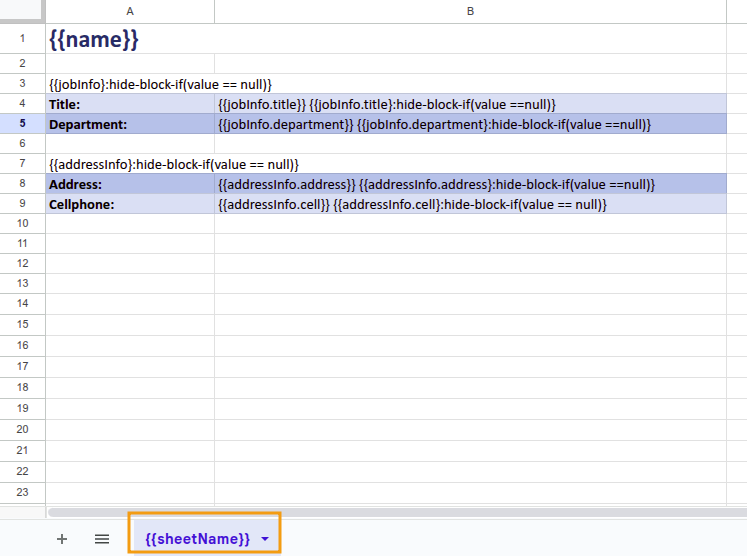 If the fully dynamic generation approach doesn't quite fit your scenario, you can try clearing sheets with a condition.This method involves using a flag value in your JSON input data and a hide-block-if condition to simply clear (hide) content that isn’t relevant.