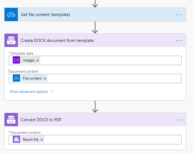 If true, get file content from OneDrive by ID (all submitted attachments are stored there), compose an object with file content and append it to the array variable: