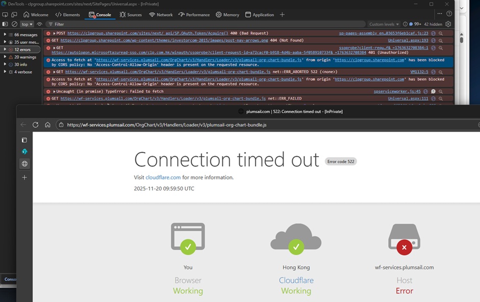 plumsail-org-chart-bundle.js, but the response is HTTP 522, if i try to access this Url directly from browser, i got connection timeout error again. Could you please check if there's any infra issue in plumsail?