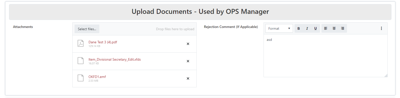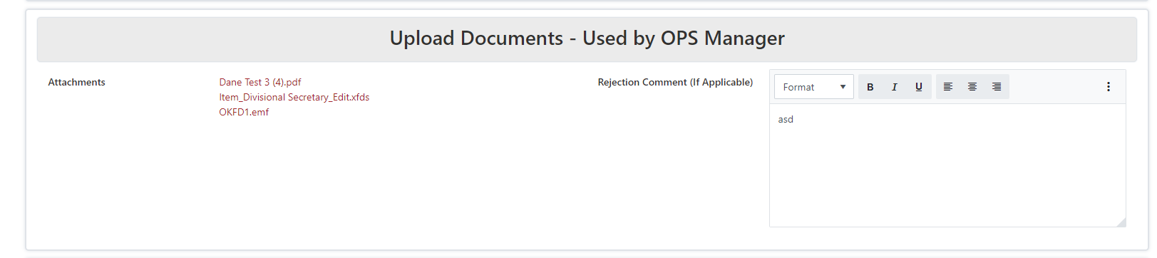 In the example below, the disabled attatchment field does not allow the user to click and view the attatchements.