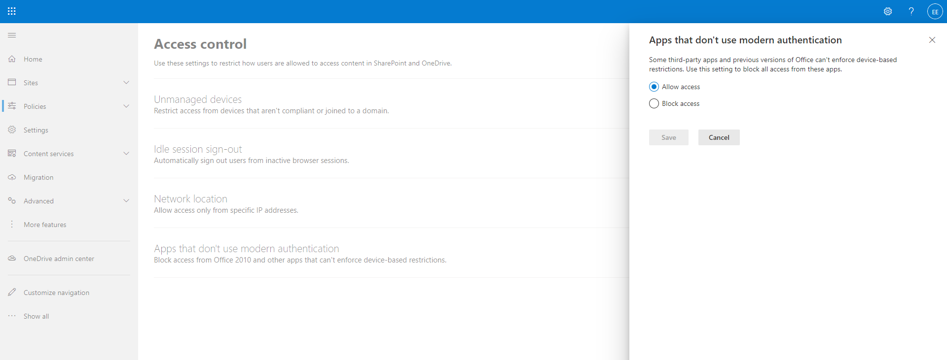 Please open SharePoint admin center and take screenshots of access control settings, provide me with them in the ticket you opened.