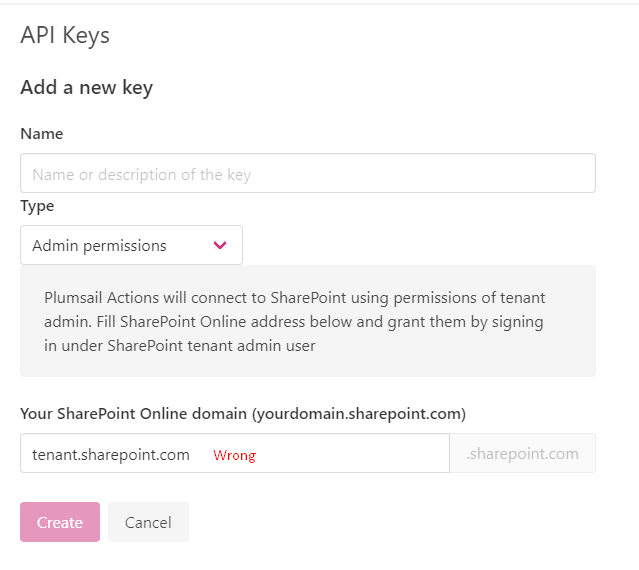 Hello! Please try to use an admin permissions API key, specify your SharePoint domain when creating it and let me know whether it works: